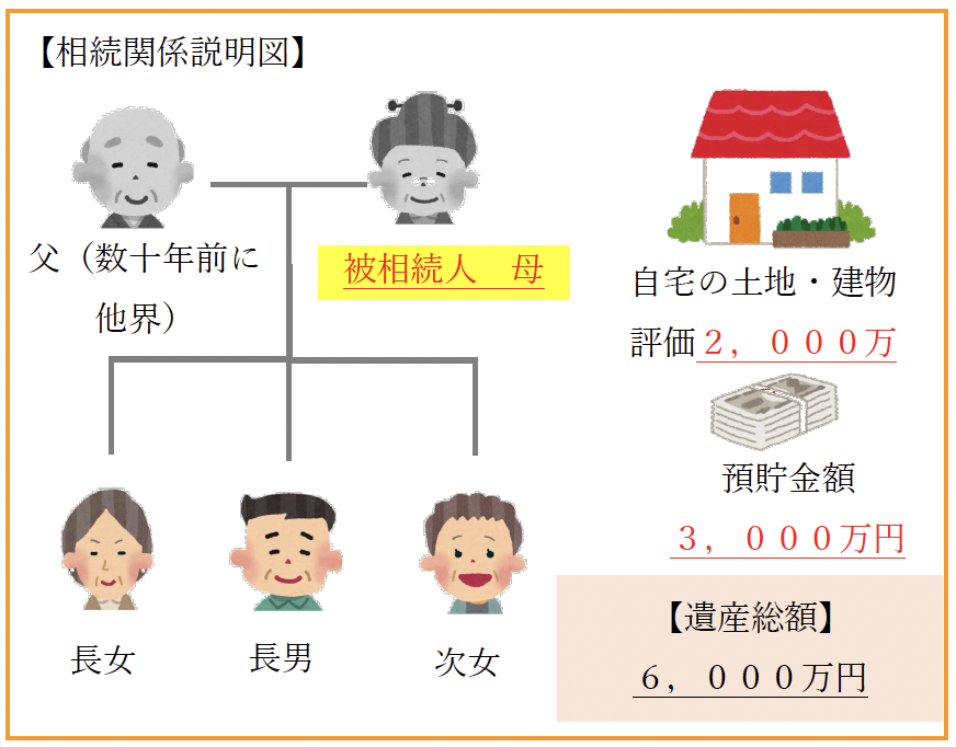 右図のご家族の場合、お母様の遺産総額は「6,000万円」であり、相続税基礎控除額の「4,800万円」との差額の「1,200万円」に対し相続税がかかり、相続税の申告と納税が必要です。