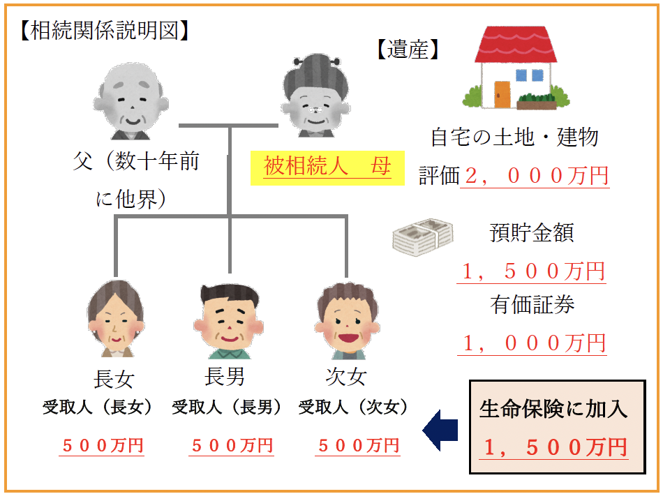 今回の例だと、生命保険の非課税額が「500万円×相続人3名= 1,500万円」になり、1,500万円までお母様がお元気な内に生命保険に加入することで、生命保険の非課税枠を利用することができます。