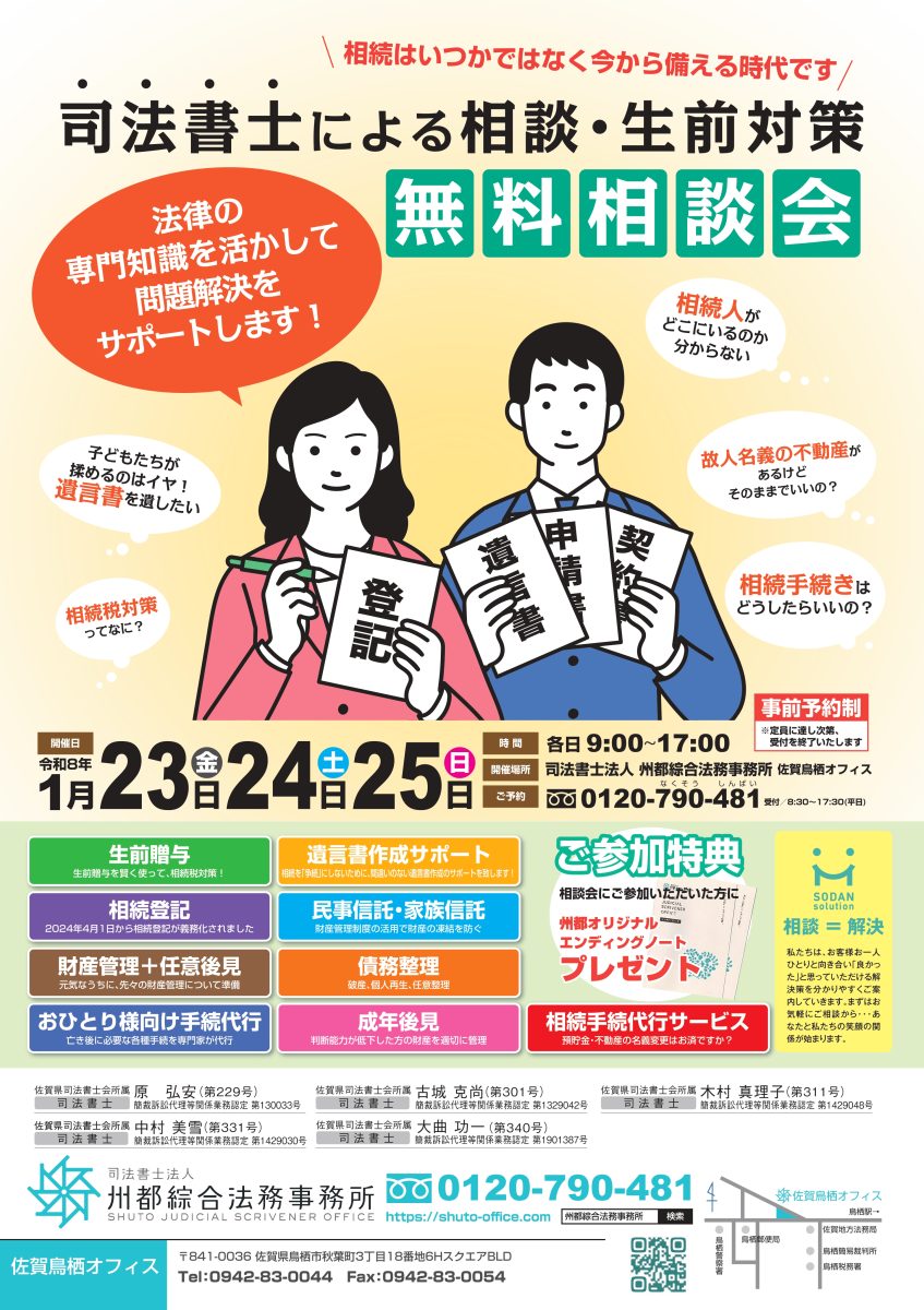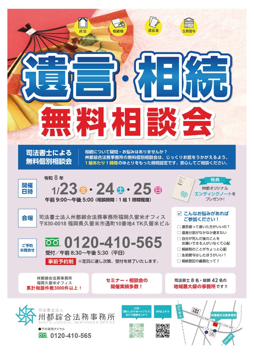 さて、新年初の無料個別相談会を令和8年1月23日(金)、24日(土)、25日(日)の3日間限定!!「遺言・相続無料相談会」を鳥栖オフィス・久留米オフィスにて開催いたします!