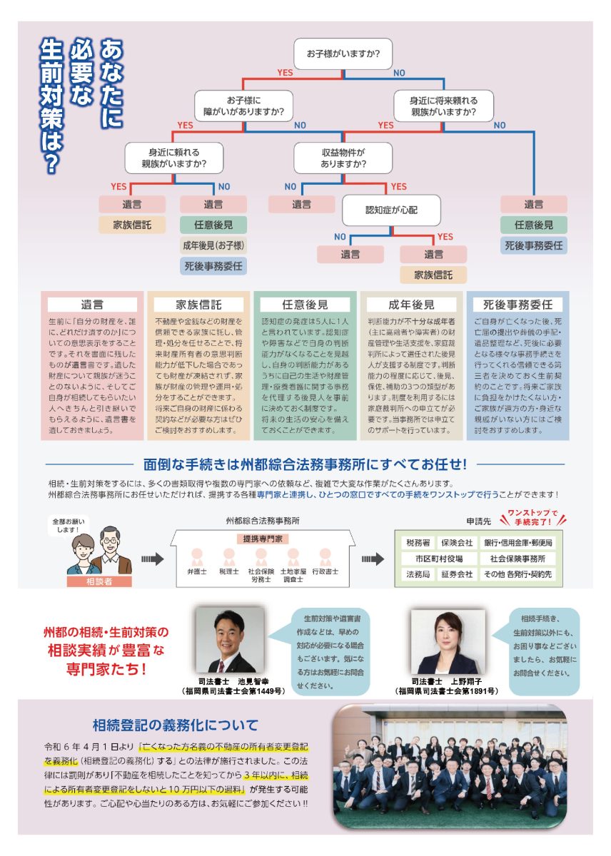 また、令和6年4月1日から相続登記の義務化がスタートしています。相続手続が未了の方、直近で相続が発生された方、また、相続手続きを機に将来のご自身の相続対策をご検討の方は、ぜひご利用ください。